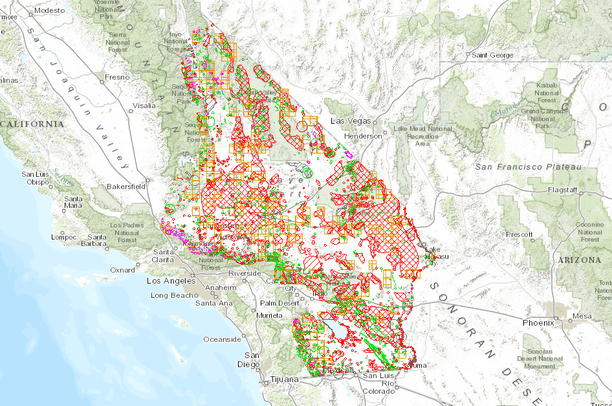 The DRECP has obtained special permission from the CA Dept. of Fish & Wildlife to display these data on public maps at scales smaller (more zoomed out) than 1:577,791. These data are not visible on maps zoomed in beyond this scale.