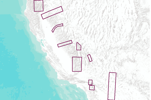 Boundaries of the proposed and in progress resurvey work of the Grinnell Resurvey Project (GRP). These transects reflect the preponderance of historic specimen localities that are targetting for resurvey work, some of which have been published as regional natural history treatises (e.g. Grinnell and Storer 1924 Animal Life in the Yosemite; Grinnell, Dixon and Linsdale 1930 Vertebrate Natural History of a Section of Northern California through the Lassen Peak Region.).