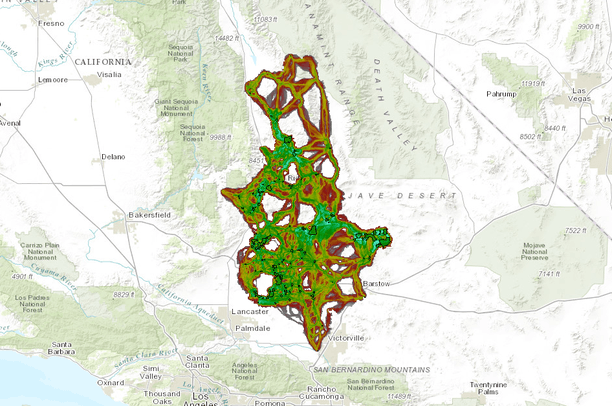 Then, we use the concept of nodes in this connectivity model, rather than traditional concept of “core areas.” We augmented our MGS observations database (elsewhere, based on CNDDB and BISON, post 2000) with post-2000 observations from Rich Inman. The Inman data have been submitted to CNDDB, but not integrated yet. We mapped all these locations, and buffered each point by 100,000 cost-distance meters. Hence, we used the MGS resistance surface, which ranges from 1-1000. So 100 m at the lowest resistance would be a cost distance of 100, and of the highest resistance would be a cost distance of 100,000. Hence observations in really high quality habitat, according to the species distribution model and/or the input resistance surface basemap, result in a relatively large area node. Observations in poor habitat will have a small area node. Overlapping nodes were dissolved, and those that were less than 1 sq. km. were removed.