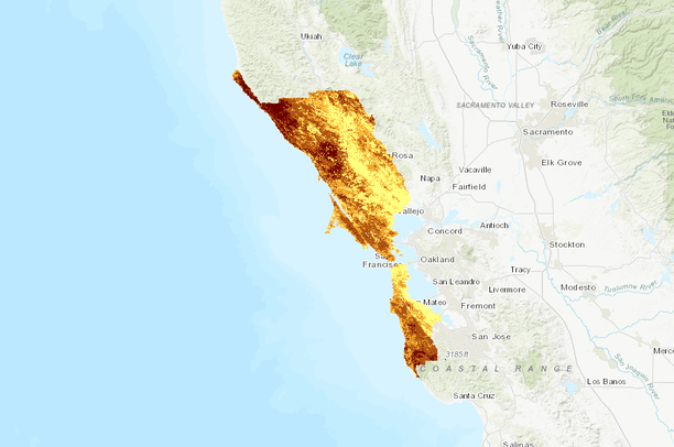 Values below the maximum sum of sensitivity and specificity threshold (0.3238) were assigned a value of 0. A land cover mask was used in post processing to convert the suitability value of high intensity development, barren, cultivated crops, and open water (NLCD 2021) land covers to 0 and the output was clipped to the Golden Gate Biosphere Network terrestrial boundary.