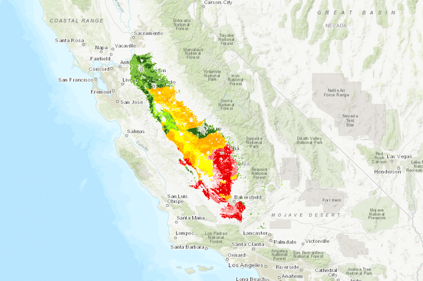 Ouput showing the geographic intersection between agricultural Land Quality and Water Stress across the San Joaquin Valley. See the attachment for more detailed information.