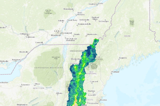 The habitat capability models developed using HABIT@ reflect the quantity, quality, and accessibility (collectively referred to as “capability”) of habitat across the landscape for each year assessed. The habitat models are based on ecological settings grids (spatial datasets) developed for the Northeast, such as cover type (largely derived from the Northeast Terrestrial Habitat Map prepared by The Nature Conservancy and Northeastern states), roads and development, and forest biomass (for forest species). The models are spatially-explicit: the value at each cell (location) depends not only on the resources available at that cell, but on resources available in the neighborhood, on the configuration of those resources, and nearby impediments to movement. However, HABIT@ does not model population dynamics or population viability.