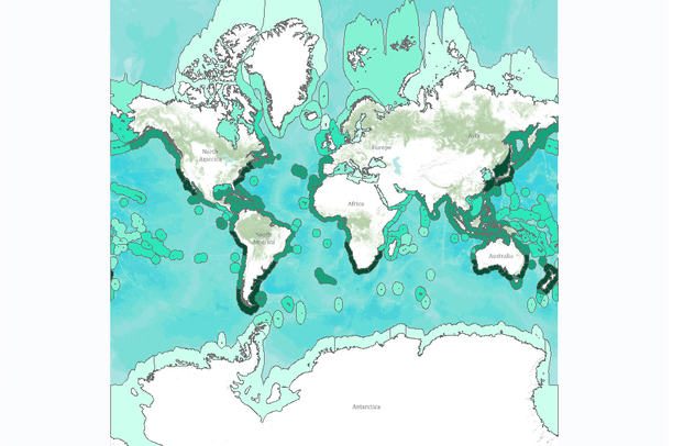 We extracted marine mammals from version 1.0 of the global polygon data set compiled by UNEP-WCMC from the publication Marine Mammals of the World (Jefferson et al. 1993) (for more information about the UNEP-WCMC source data set, e-mail spatialanalysis@unep-wcmc.org). There were 118 species in the data set (including cetaceans, sirenians, pinnipeds, and other marine carnivores). These included coastal and high seas species, although the latter may only occasionally venture onto continental shelf areas. It is likely that total diversity is underestimated for the Southern Ocean Realm, particularly the sub-Antarctic islands, because certain species in this realm did not have full polygon range maps. We used the range maps to calculate the number of species per marine ecoregion.