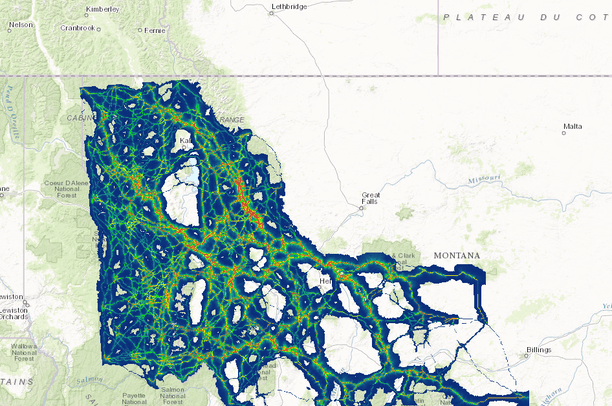 Black Bear movement corridor strenght predicted from a factorial least cost path analysis across a resistance map. This layer shows the major nodes through which large numbers of least cost routes pass. The areas of highest corridor intensity form a dendritic network showing the major linkages among portions of the analysis area