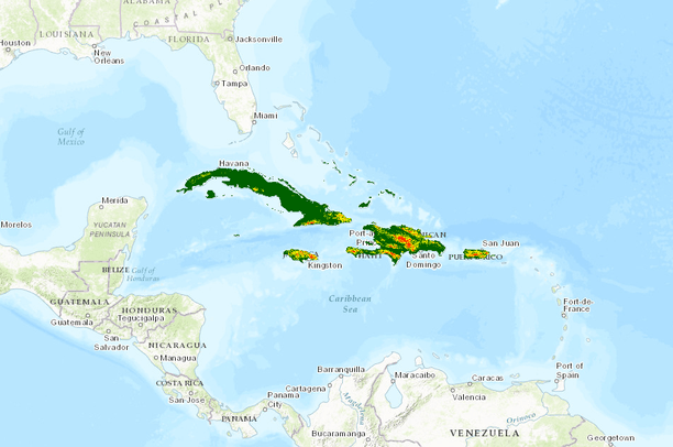 Conservation planning and implementation require identifying pertinent habitats and locations where protection and management may improve viability of targeted species. The winter range of Bicknell’s Thrush (Catharus bicknelli), a threatened Nearctic-Neotropical migratory songbird, is restricted to the Greater Antilles. We analyzed winter records from the mid-1970s to 2009 to quantitatively evaluate winter distribution and habitat selection. Additionally, we conducted targeted surveys in Jamaica (n = 433), Cuba (n = 363), Dominican Republic (n = 1,000), Haiti (n = 131) and Puerto Rico (n = 242) yielding 179 sites with thrush presence. We modeled Bicknell’s Thrush winter habitat selection and distribution in the Greater Antilles in Maxent version 3.3.1. using environmental predictors represented in 30 arc second study area rasters. These included nine landform, land cover and climatic variables that were thought a priori to have potentially high predictive power. We used the average training gain from ten model runs to select the best subset of predictors. Total winter precipitation, aspect and land cover, particularly broadleaf forests, emerged as important variables. A five-variable model that contained land cover, winter precipitation, aspect, slope, and elevation was the most parsimonious and not significantly different than the models with more variables. We used the best fitting model to depict potential winter habitat. Using the 10 percentile threshold (>0.25), we estimated winter habitat to cover 33,170 km2, nearly 10% of the study area. The Dominican Republic contained half of all potential habitat (51%), followed by Cuba (15.1%), Jamaica (13.5%), Haiti (10.6%), and Puerto Rico (9.9%). Nearly one-third of the range was found to be in protected areas. By providing the first detailed predictive map of Bicknell’s Thrush winter distribution, our study provides a useful tool to prioritize and direct conservation planning for this and other wet, broadleaf forest specialists in the Greater Antilles.