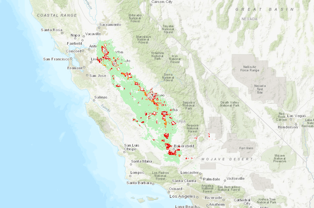 Development threat level across agricultural areas of the San Joaquin Valley.