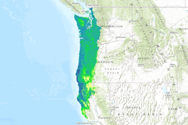 Average projected future (across 5 regional climate models using the A2 emissions scenario) density (birds per hectare) model of Pacific-slope Flycatcher (Empidonax difficilis) using a Boosted Regression Tree model (Hastie & Tibshirani 2000) informed by breeding season avian point count data, modeled vegetation types, and climate data from 1) Weather Research Forecasting Grell Model (WRFG) with boundary conditions driven by the Third Generation Coupled Global Climate Model (CGCM3); 2) Weather Research Forecasting Grell Model (WRFG) with boundary conditions driven by the Community Climate System Model (CCSM); 3) Regional Climate Model v3 (RCM3) with boundary conditions driven by the Geophysical Fluid Dynamics Laboratory Global Climate Model (GFDL); 4) Regional Climate Model v3 (RCM3) with boundary conditions driven by the Third Generation Coupled Global Climate Model (CGCM3); and 5) Canadian Regional Climate Model (CRCM) with boundary conditions driven by the Community Climate System Model (CCSM) averaged for the years 2041-2070 and available from http://www.narccap.ucar.edu/.