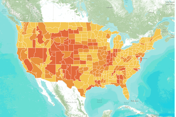 This time-enabled layer shows areas of moderate to extreme drought for the lower 48 states for July (Mid-peak growing season) for the years 1895 through 2012.