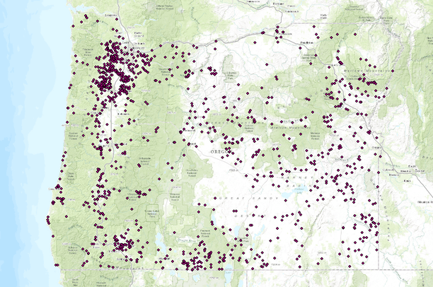 Oregon large dams. Large dams are defined by a dam height >= 10 feet and storage of >= 9.2 acre feet. These larger dams are within the juristiction of Oregon Water Resource Department.