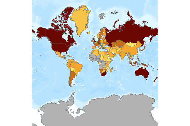 The numbers of introduced and established or probably established mammals were based on Long (2003). These data for many countries and oceanic islands were presented in a table in the book introduction and include translocations and re-introductions. Some regions included in the table covered broader geographies than countries (e.g., North America, South America, Russian Federation & associated independent states). To be able to show these data at country level, the data were compiled from the text descriptions of species introductions in the book. Data from Long, J.L. 2003. Introduced Mammals of the World: Their history, distribution and influence. CSIRO Publishing, Collingwood, Australia.