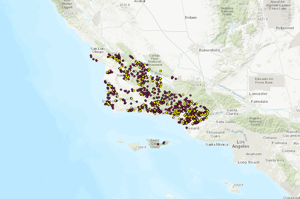 These sample points within large fires from 1980-2019 were used to train and test a large fire occurrence probability model for Santa Barbara county. We used fire perimeter data for 201 large (> 40-ha) fires from the State of California Fire and Resource Assessment Program (FRAP) fire history database, which covered our entire time period of interest. We generated a random sample of points within fire perimeters using the method developed by Davis et al. (2017): the number of random points generated within each fire perimeter was equal to the square root of the area within the perimeter divided by 40. We forced a minimum distance of 500 m between the random points (based on testing of best distance in the northern Sierra Nevada - Southern Cascades; Syphard et al. 2018) to increase spatial independence and reduce spatial autocorrelation and model performance inflation (Veloz 2009, Boria et al. 2014). This process resulted in establishing 840 total sample points within large fire perimeters. We reserved 20% of those points for model evaluation, leaving a total of 669 points for model training.