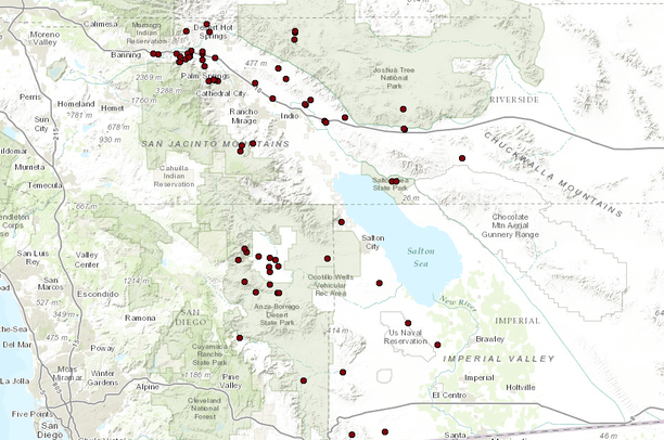 The DRECP has obtained special permission from the CA Dept. of Fish & Wildlife to display these data on public maps at scales smaller (more zoomed out) than 1:577,791. These data are not visible on maps zoomed in beyond this scale.