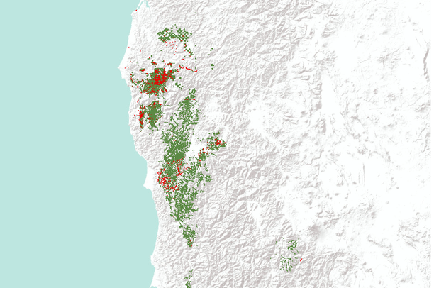 California and Southern Oregon. Areas not infected by P. lateralis are