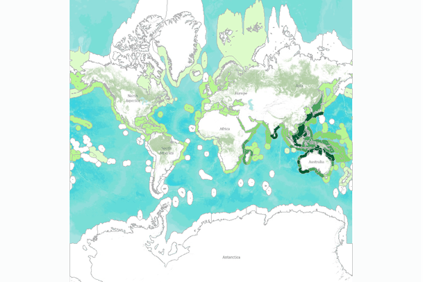 We extracted seagrasses from version 2.0 of the global polygon and point data set that was compiled by UNEP-WCMC in 2005 (for more information about the source data set, e-mail spatialanalysis@unep-wcmc.org). These same data were originally published in the World Atlas of Seagrasses (Green and Short 2003; see, in particular, the chapter by Spalding et al. 2003). The source data for the habitat map were a mix of point and polygon information gathered from a major literature review as well as from national-level mapping programs. We developed the species diversity map from range maps drawn for fifty-five species. The four species from the genus Ruppia were not mapped because these are not always reported and are often found outside seagrass habitat.