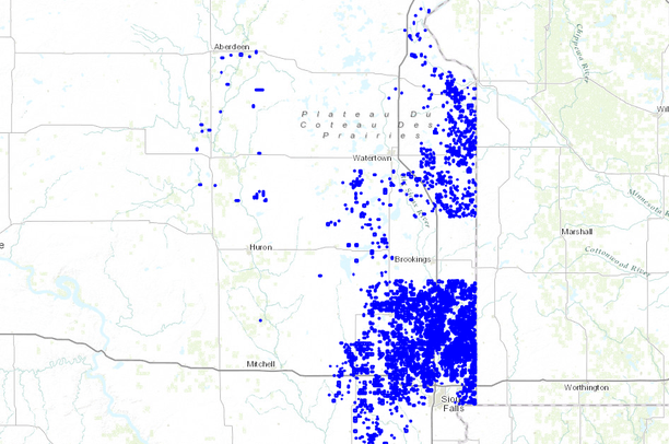 Dataset contains locations of drainage tile permits in South Dakota obtained from County and Local Water Board records. The counties included are: Brown, Deuel, Grant, Hamlin, Hanson, Kingsbury, Lake, McCook, Minnehaha, Moody, Roberts, Spink, and Turner. The date permits records were collected vary by county. A majority of the permits from counties were collected as of January 2012. Two counties (Hanson and Minnehaha) were updated in December,2013. In addition to the location (as a TRS) and available (if given)pipe information recorded on the permit, this dataset provides the latitude and longitude of the location given on the permit, which is not typically provided on the permit application or record. Additionally, overlap of permit polygons (if depicted in a geospatial application) is possible from two permits that share the same area. Permit applications that were: denied, applied to small tracts of homes (home drainage systems), residential subdivisions, ditches, maintenance, or had incomplete TRS information were removed from this database.