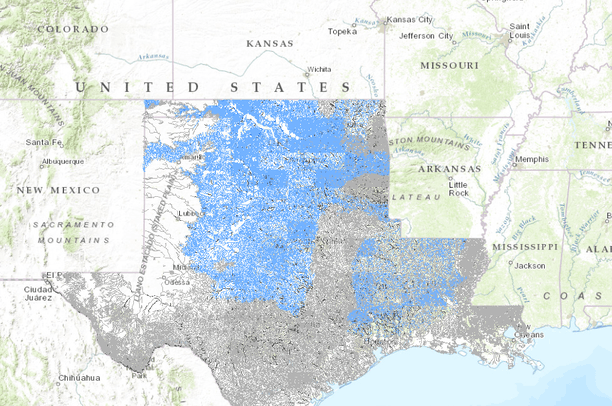 NHDplus segments are coded for the likelihood of the Arkansas River Shiner being present. The likelihood