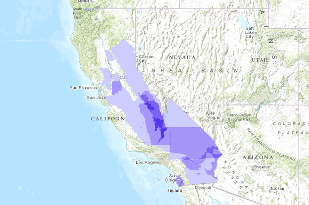 This dataset shows a heatmap representation of land covered by conservation plans that include threats from drought in California.