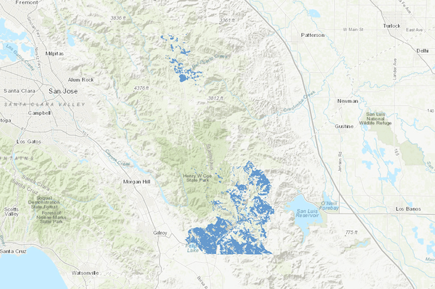 Documented occurrences of focal species within the Santa Clara County RCIS area were used to visually evaluate and refine the habitat distribution models. The data used to identify locations of occurrence of focal species, and to inform the development of the focal species’ habitat models come primarily from the CNDDB (California Natural Diversity Database 2016), with some additional data from the USGS’s Biodiversity Information Serving Our Nation (BISON) database (U.S. Geological Survey 2016). These occurrence records are also displayed in the habitat distribution map. In addition, occurrence data specific to the Habitat Plan (i.e., from a source other than CNDDB) were reviewed to identify suitable land cover types for the focal species’ habitat models, but were not included on the habitat distribution maps. See Section 2. 3.5.2 Habitat Distribution Models , Focal Species Locations for data sources and criteria and methods used for
