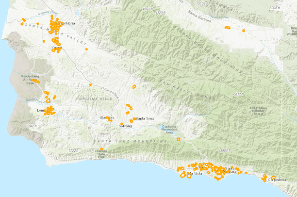 This data shows the 600-foot buffer exclusion zones around schools, day cares, and youth centers in Santa Barbara County.