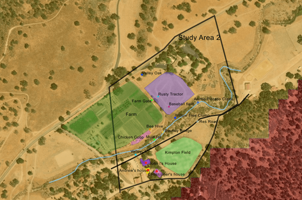 For my Study of the Midland property Project, I was given study site #2. It stretches from Figueroa Mountain road to the Art room and all the way to the entrance gates of the barn. The school uses this area for various things such as the farm to grow food for the school, the field which is used for sports, and the school also parks most of their vehicles in area #2 as well. Andrew, John Isaacson, and Christopher Barnes also live in this Area of the Midland property. Study site #2 is located on one major type of geological formation. This formation is QPc or Paso Robles formation. In this study area there are two major plant communities. The creek runs through the middle of the study site and is a riparian community. On both sides of the creek there is an oak savannah and on the southern border of my study site there is an oak woodland. Most of the native plants in this area live around the creek and in open fields next to the farm and Family School. Some of these native plants include Valley oaks, Live Oaks, Willows, and Mulefat. Some landmarks in area #2 include Alamo Pintado creek that runs through the middle of this area. Other notable landmarks include the farm, rez road, and the baseball field. Some of the points I have chosen are the Baseball field, the chicken coop, the bouncy bridge across the creek, a valley oak tree, Mulefat in the creek, and a couple other notable or cool landmarks in the area.