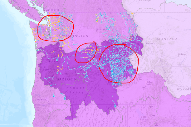 This map combines data on designated critical habitat as well as essential exceeded habitat for the Bull Trout. It also highlights the change in snowmelt timing from 1975-2040. The areas of interest show critical trout habitat in areas where snowmelt is occurring earlier by 1-3 weeks, 2-3 weeks, and over 3 weeks. These timing changes can greatly effect river ecosystems, and in turn fish such as trout.