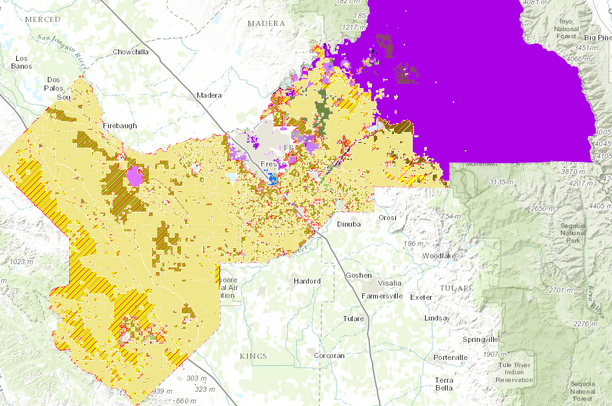 This map shows zoning in Fresno County, CA that allows for the possibility of solar development.