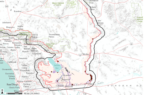 Based on examination of species observation data and consultation with biologists, CBI used the model's broad extent output masked to within 10 km of the Colorado River and the following USFS ecoregion subsections: 322Cd, 322Cc, 322Cb.