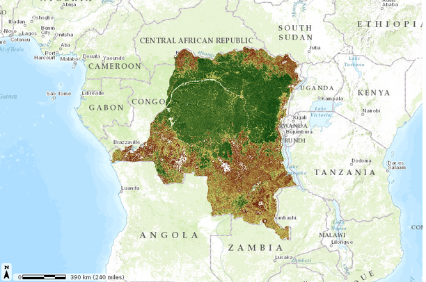 Map of the Democratic republic of the Congo showing landcover, roads, hydrology, locations of villages, water sources, and parks.