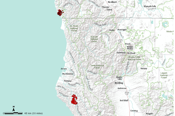 This map shows the distribution of Phytophthora ramorum in Oregon and California