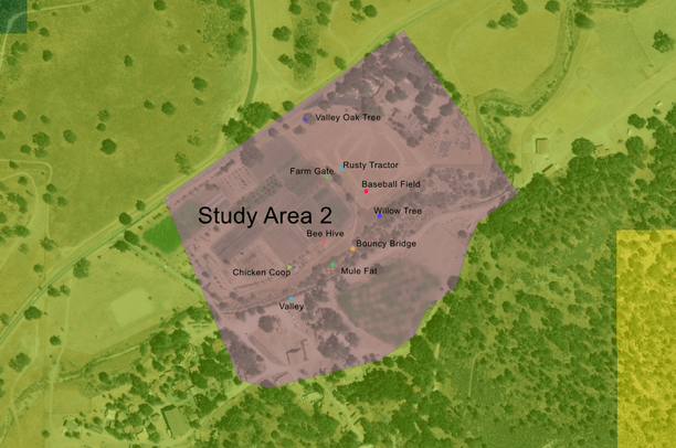 In Study area 2, which has most of the farm and soccer field, is used for farming and playing soccer. In the field, we played a lot, such as soccer, crosscountry, football, and water games. In the farm, there are a lot of fruits and vegetables. There are mulefat and valley oak in the area. The creek crosses that area. It is not obvious to see the valley in the study area. The area is also near the Figueroa Mon. Road. The boundaries are the road to the inside of Midland, Figueroa Road, the side of the field and far to the family school. We are going to do these following points: the gate of farm on the side to the Family school, chicken coop that is in the south side of farm where I have been for the first time, valley oaks near the road, mulefat on the sides of creek, the bridge between the farm and the field, the valley across our study area, the tractor between the farm and the Family school, and so on. This area is near the yards which is great. Also there are some notable landmarks such as Heybarn and Farm. For the map, there will be three datasets, which are the water resource areas of interest, normalized difference vegetation index, and the geology layer of California. I did these points with my partner and we went to the area on Sunday afternoon. It took about one and half hours to finish all the GPS points.