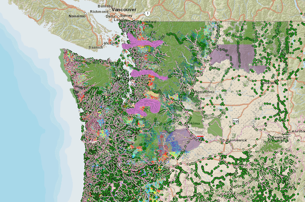 This map has multiple layers that show priority areas for the Pacific Northwest to conserve areas that are critical to aquatic connectivity. The first layer shows the conversion threat index, or those areas that are at lowest/highest risk for being converted for anthropogenic uses. Additionally there is a layer that shows the protected areas around Washington State. I added two layers that shows the potential stream barriers that are shown by the green dots and the anadromous fish distribution in the Pacific Northwest shown by the various colored lines. The areas that I thought were of highest priority, shown by the pink polygons), were areas that had anadromous fish distributed along with many potential stream barriers in areas that were unprotected and at high risk for anthropogenic conversion (red/yellow areas). These tended to be along major roads such as Highway 2. I made the areas connect from the protected areas to major bodies of water like the puget sound to show that the entire water network must be preserved in order to conserve aquatic connectivity.