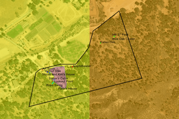 Kim's house, my cabin, a lookout point, a rope swing, Faith's house, the amphitheater, a walnut