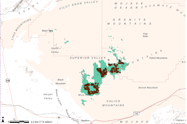 This map shows output from the CBI statistical (Maxent) species distribution model for the Lane Mountain milk-vetch,