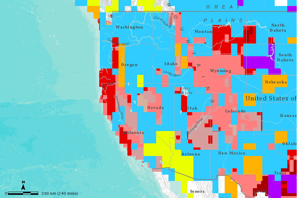 Overlay of 2 sets of % sand in 3 layers of the soil profile, one at 800m and another one at 50km spatial grains, used in two different projects to simulate vegetation dynamics in the conterminous USA.
