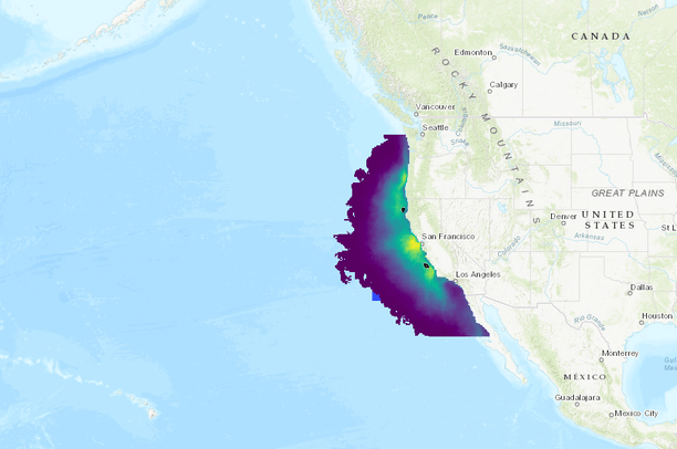 This map has been created to support the State of California in offshore wind energy planning. This map shows areas of krill abundance and krill hotspots. Krill are abundant in areas of high ocean productivity and can be used as a proxy for abundance of marine predators.
