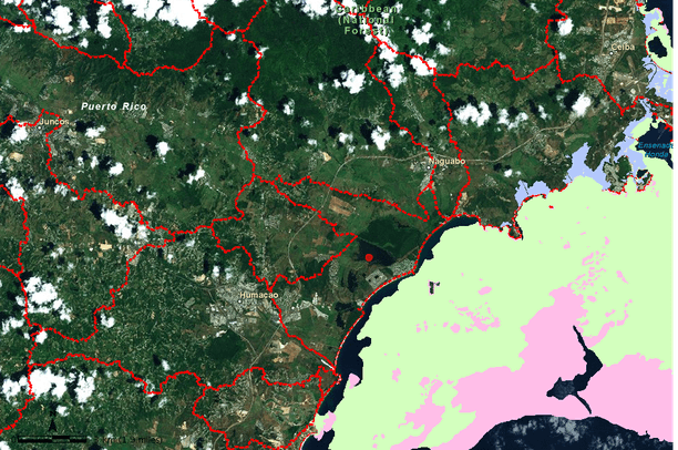 Cuencas hidrográficas de la Reserva Natural de Humacao (marcada por un punto rojo) y mapa de las comunidades bénticas que reciben los efluentes de la Reserva.