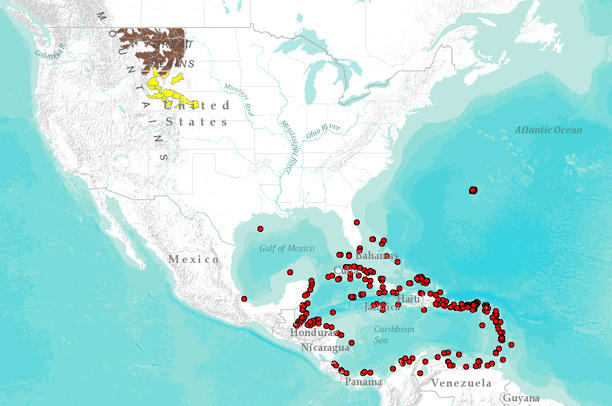 This is a map of unrelated datasets. Caribbean protected areas and Emerald darter.